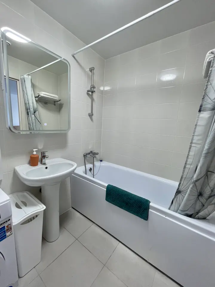 - Санузел совмещённый, ванна, стиральная машина, фен, утюг