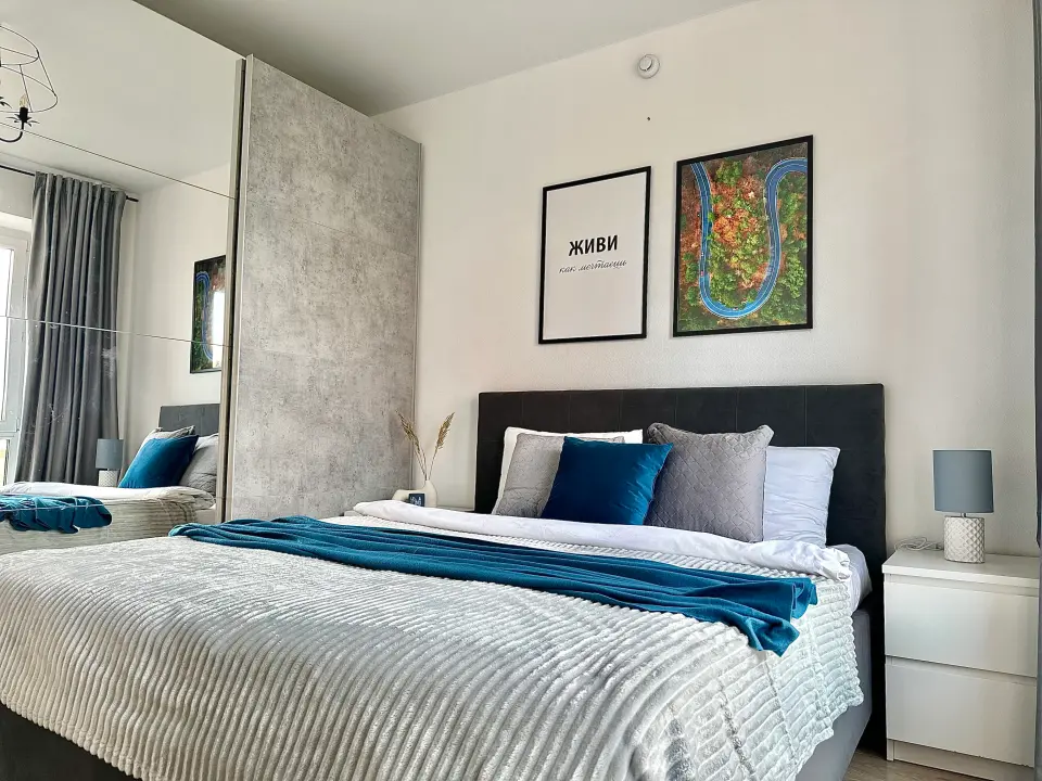 - Вместимость до 4 гостей (двуспальная кровать и раскладной диван)