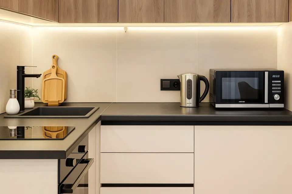 • Посуда и кухонные принадлежности: кастрюли, сковородки, тарелки, чашки, бокалы, стаканы, столовые приборы — всё для удобного приготовления пищи и комфортного приема пищи