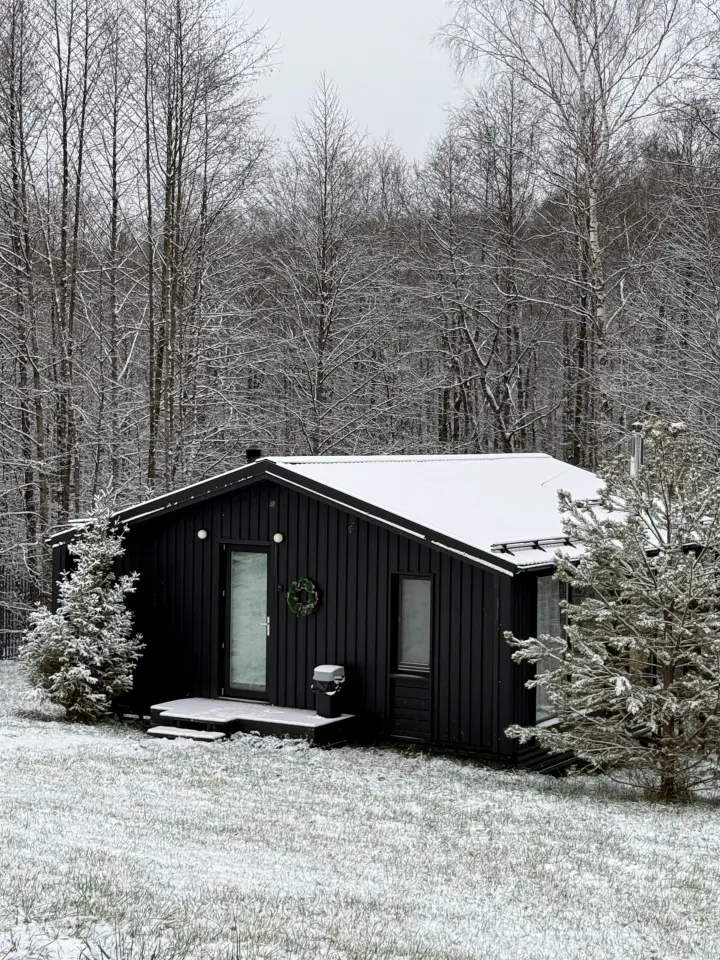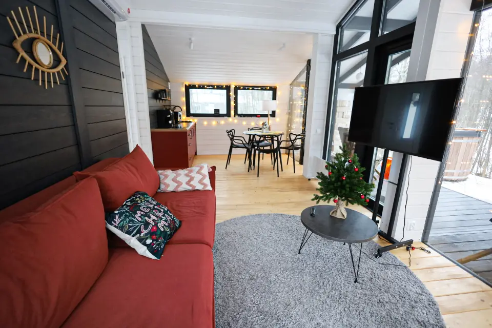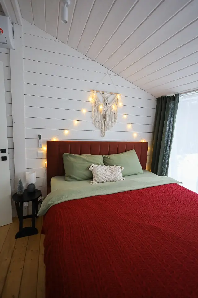 Возможно размещение до 4х человек. В доме есть отдельная спальня с двуспальной кроватью, а в просторной гостиной находится раскладной диван. По запросу установим детскую люльку.