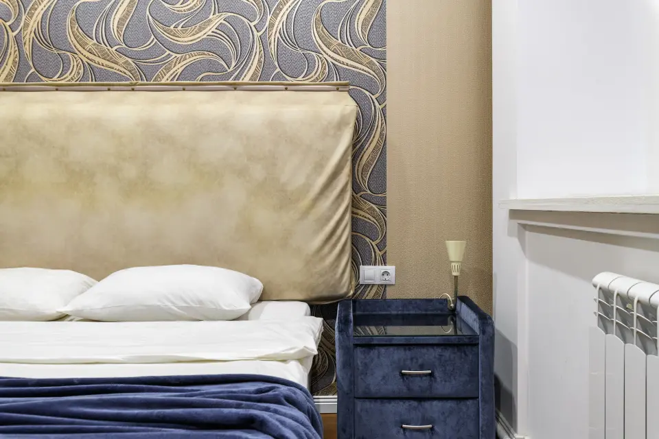 Вместительный шкаф, комод, прикроватные тумбочки.