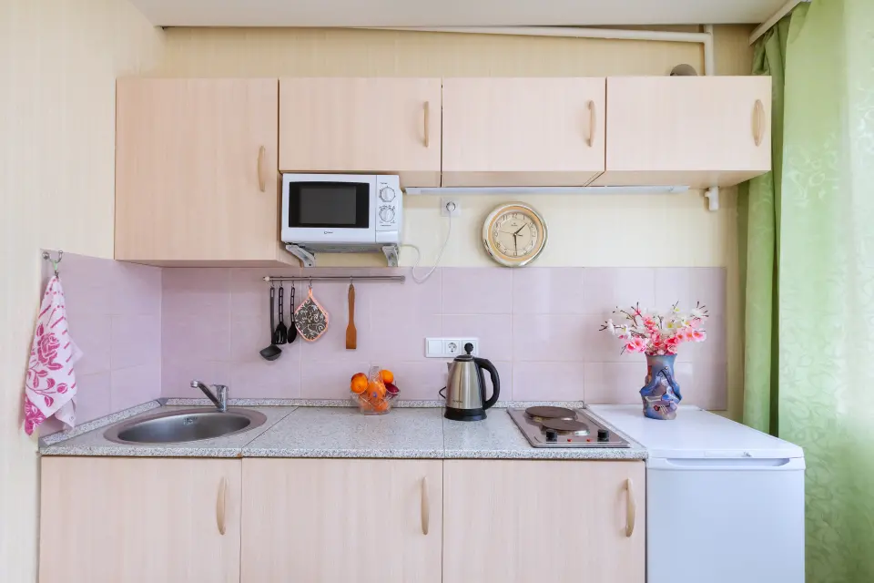 плита, микроволновка печь, чайник, стиральная машина, сушилка для белья.