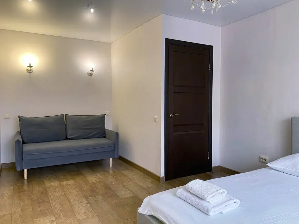 Основной зоной является спальня с двуспальной кроватью, аккуратно застеленной свежим постельным бельем, и мягким диваном, который отлично подойдет для отдыха. В интерьере преобладают светлые тона, что создает ощущение простора и уюта. Просторные окна обеспечивают хорошую естественную освещенность.