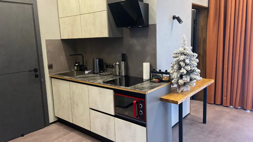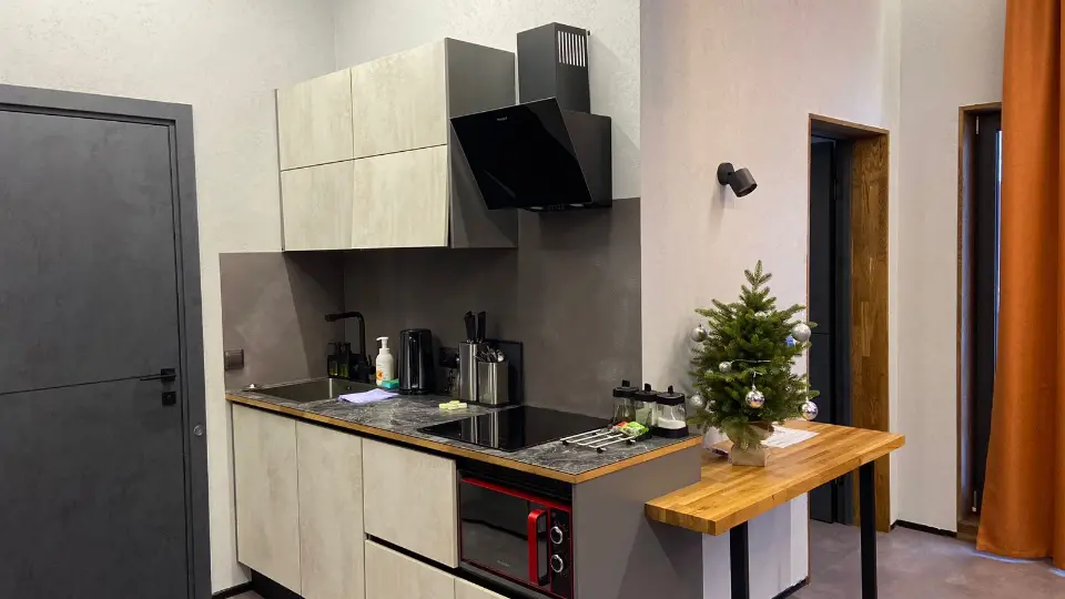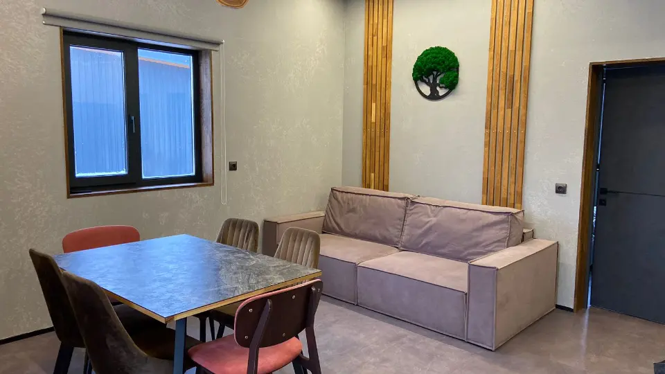Все необходимое для комфортного проживания: две спальни с двуспальной кроватью, кухня гостиная с раскладными диваном. На кухне: вся необходимая техника: плита, микроволновая печь, посудомоечная машинка, чайник; посуда; обеденный стол на 6 персон, ТВ и мультимедиа, Wi-Fi на всей территории. Вблизи есть баня за доп. оплату.