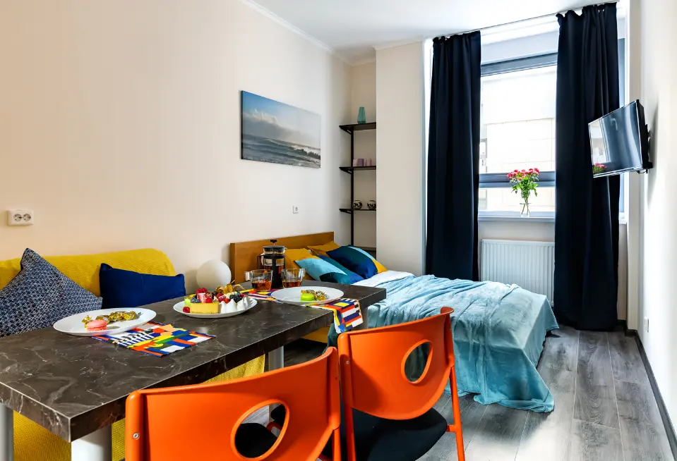 Уютная студия вмещает до 4-ти гостей и находится на 7 этаже дома бизнес-класса в ЖК “Граф Орлов”. В квартире есть все необходимое для комфортного проживания: двуспальная кровать, раскладной диван, телевизор, кухонная зона со всем необходимым, совмещенный санузел.