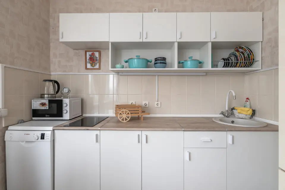 - Бытовая техника: электрическая плита, посудомоечная машина, микроволновая печь, холодильник, чайник, кондиционер, стиральная машина, фен, утюг;