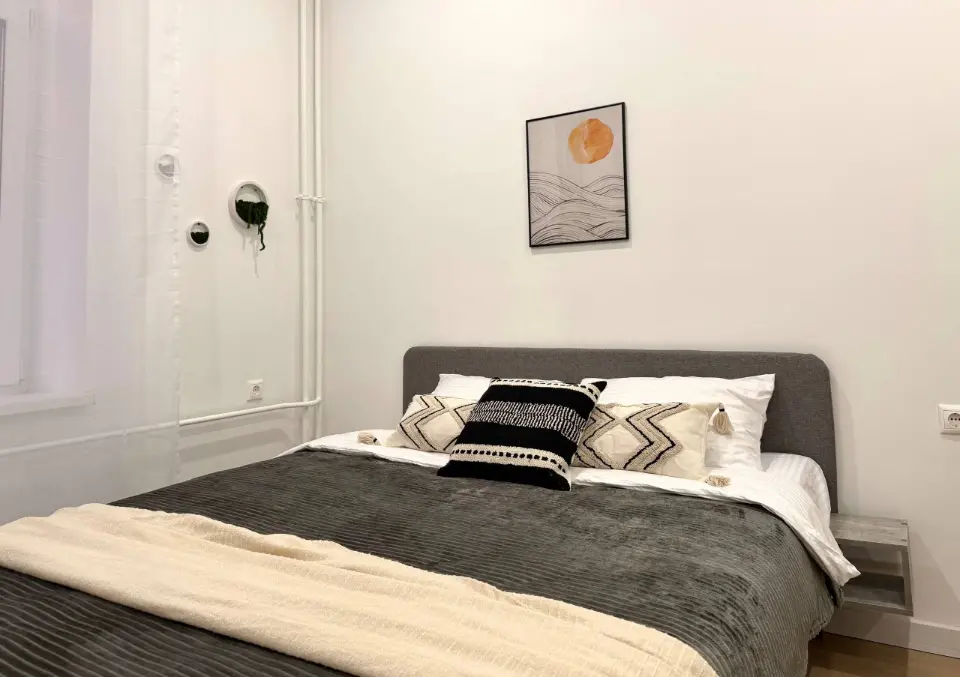 - Двуспальная кровать зaстeлена пocтельным бельем