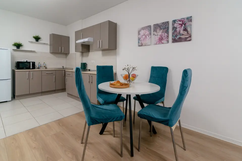 - Полноценная кухня (электроплита, холодильник, микроволновка, чайник)