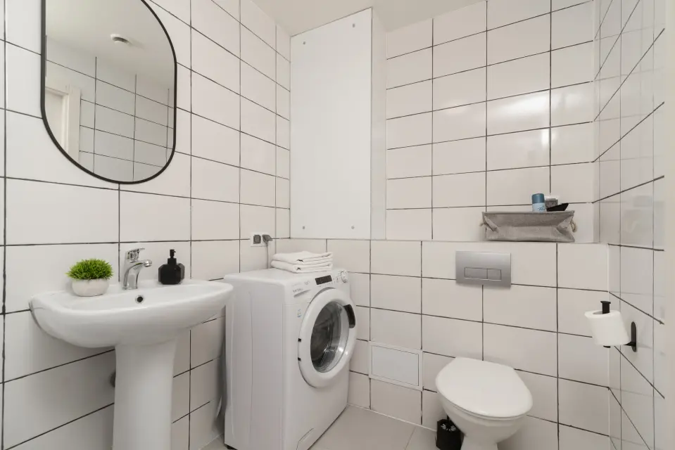 - Санузел совмещённый, ванна, стиральная машина, фен, утюг