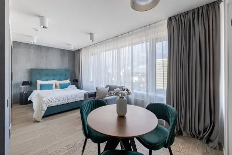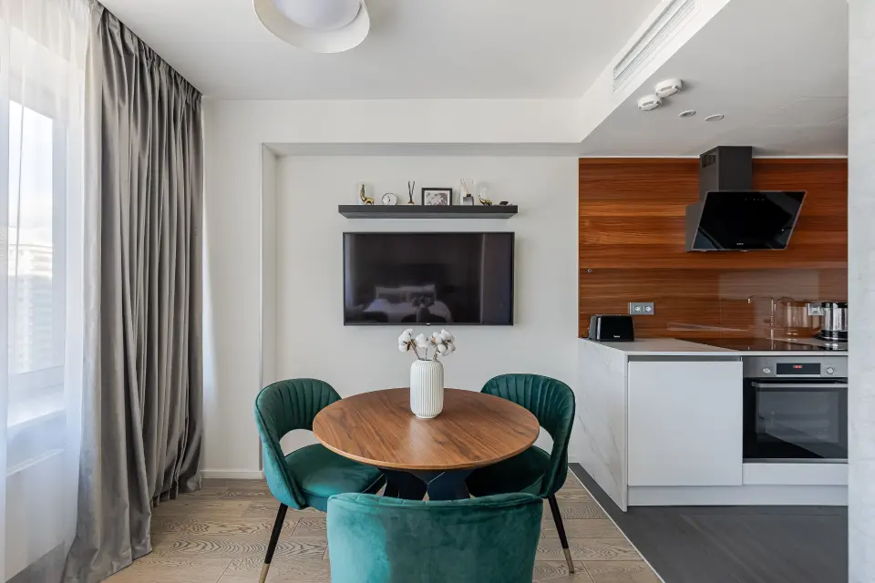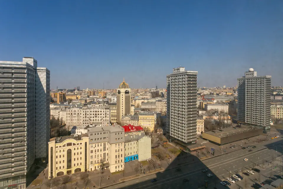 Представьте: вы просыпаетесь в изумрудно-золотистых интерьерах, залитых светом из огромных панорамных окон, а прямо за стеклом — легендарный Новый Арбат. Апартаменты в «The Book» — это сочетание исторического контекста и сервиса нового поколения.