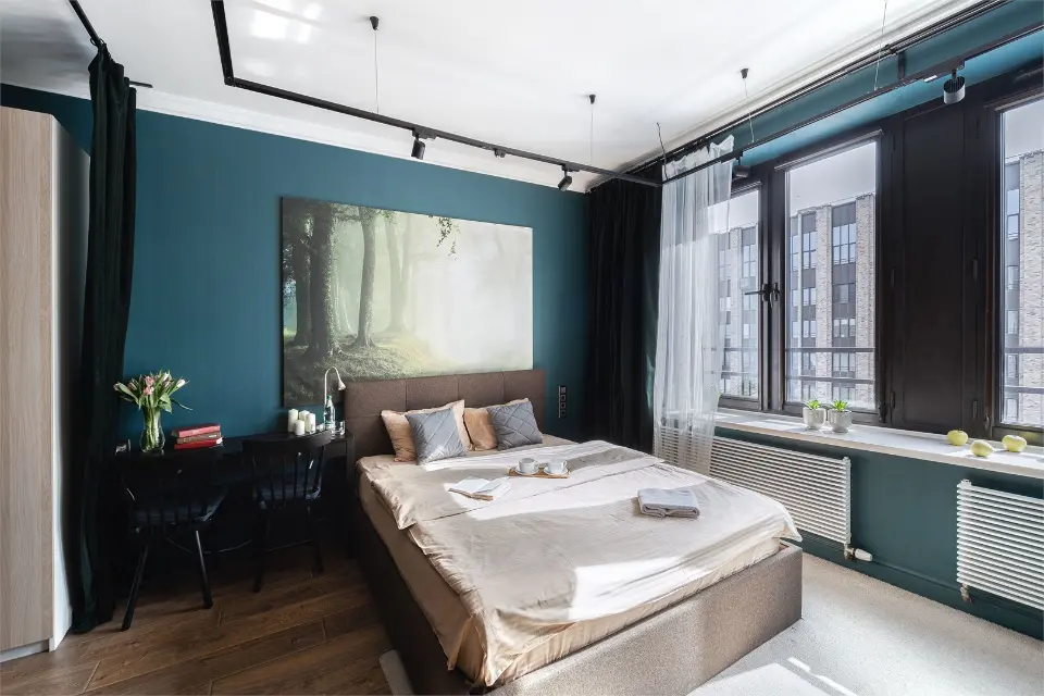 Дизайнерский ремонт, словно переносит вас в ночной лес где-то в горах, где царит полное единение с природой. Тёплая текстура дерева и насыщенные зелёные акценты создают гармоничную атмосферу, в которой хочется наслаждаться моментом.