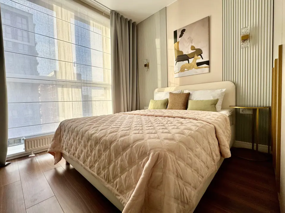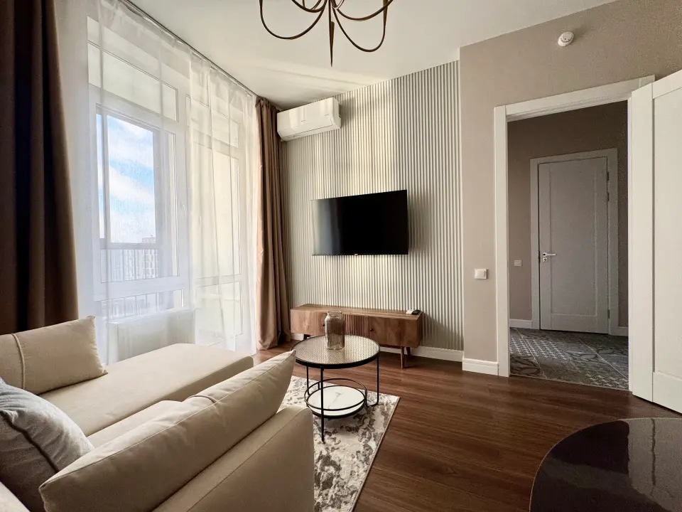 Стильная 2-комнатная квартира с видом на реку, площадью 38,4 м², расположенная в новом доме бизнес-класса на 12-ом этаже ЖК Прокшино, рассчитана на размещение до 3-х гостей и оснащена одной двуспальной кроватью и диваном.