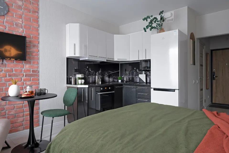 - Укомплектованная кухня: плита, чайник, кофемашина, микроволновая печь, духовой шкаф, холодильник, посуда и столовые приборы.