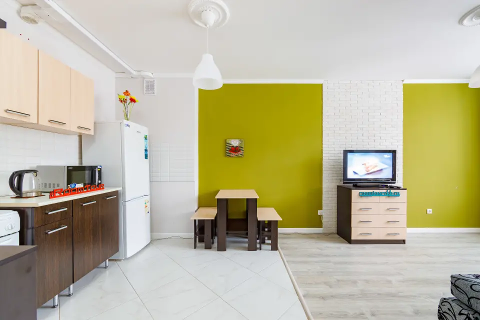 - Кухня оборудована всей необходимой бытовой техникой (плита, холодильник) и посудой.
