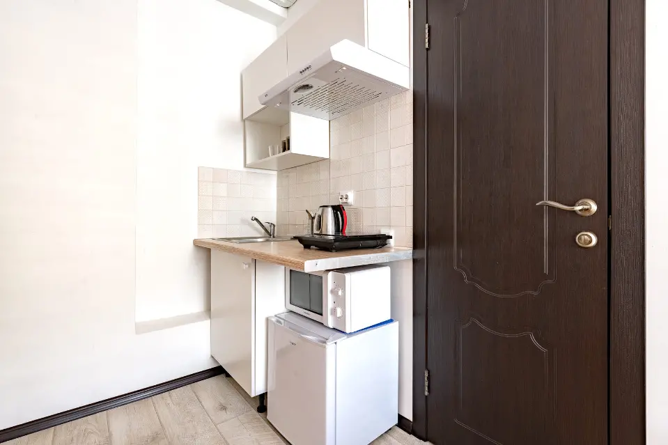 Полностью оборудованная кухня с индукционной плитой, электрическими чайником, микроволновой печью, вместительным холодильником, посудой для приготовления пищи и сервировки стола.