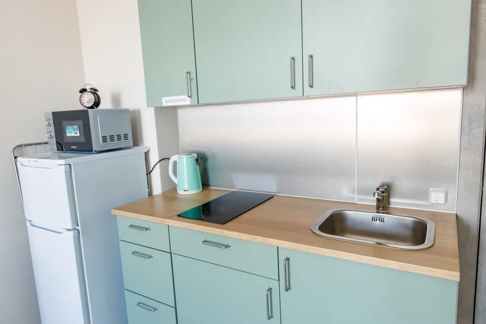 - Кухня оборудована всей необходимой бытовой техникой (плита, холодильник) и посудой