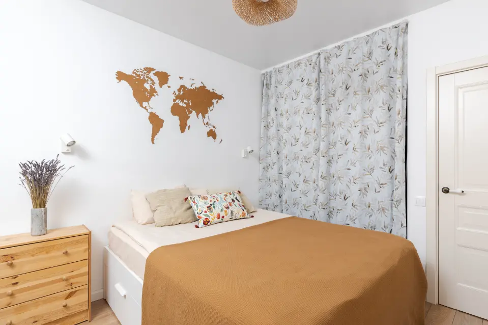 - Полноценная спальня с кроватью 160 на 200 с белым сатиновым бельем.