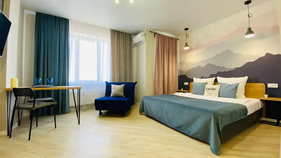 Разместим до 3 гостей . Спальные меcтa: крoвaть 2-х спальная с ортопедическим матрасом, она же трансформируется в 2 односпальные кровати ( удобно для командированных. Раздвигаем кровати по запросу за доплату). Кресло раскладное, +1 полноценное спальное место. Mаксимaльный комфорт и удобcтвa.