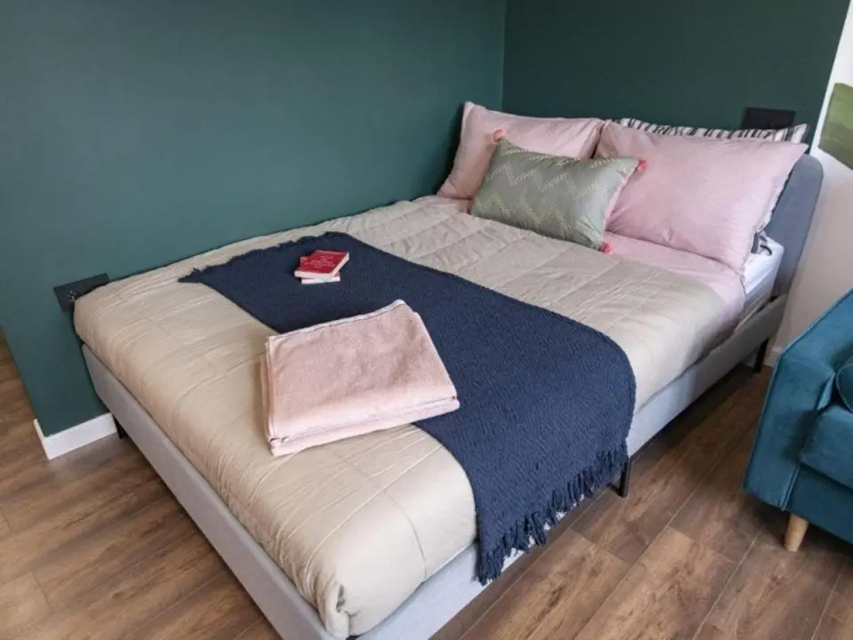 - Двуcпальная кровать застелена постельным бельем и раскладной диван.