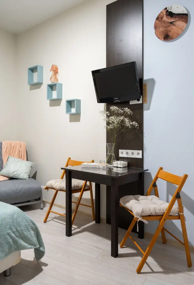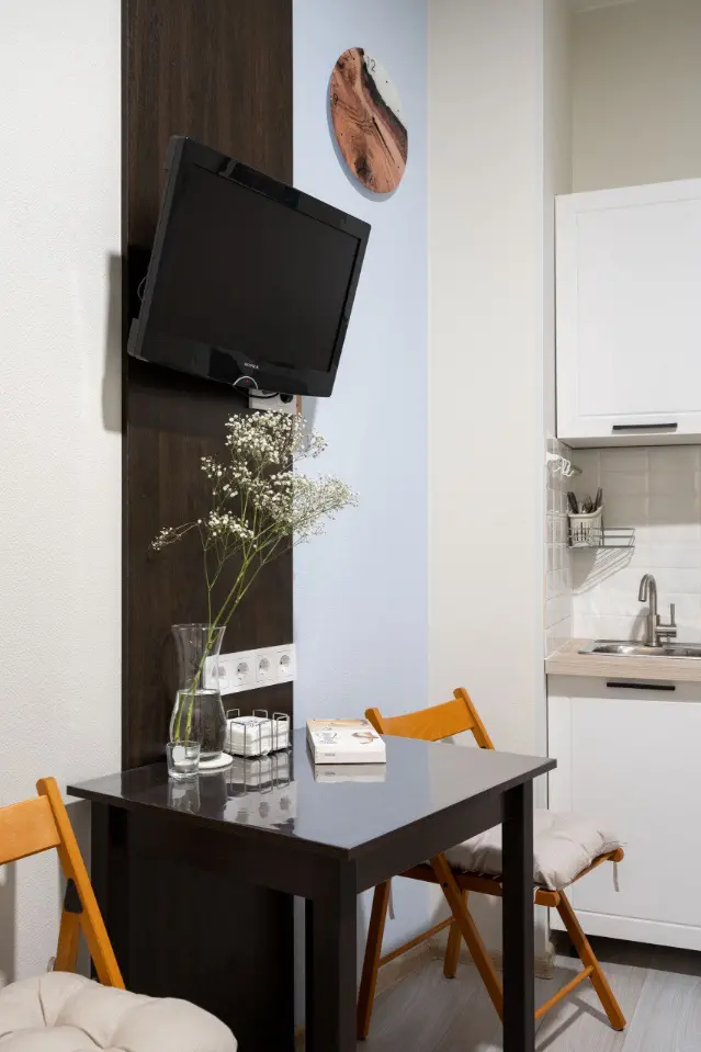 - Хорошо укомплектованная кухня, чайник, микроволновая печь, холодильник, индукционная плита, посуда и столовые приборы, обеденный стол и табуреты с мягкими сиденьями.