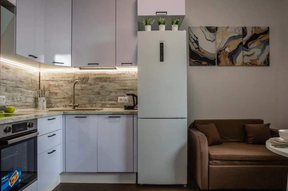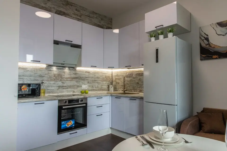 - Полностью укомплектованная кухня, встроенная техника: электрическая плита, духовой шкаф, вытяжка, посудомоечная машина, чайник, микроволновая печь, холодильник, посуда и столовые приборы.