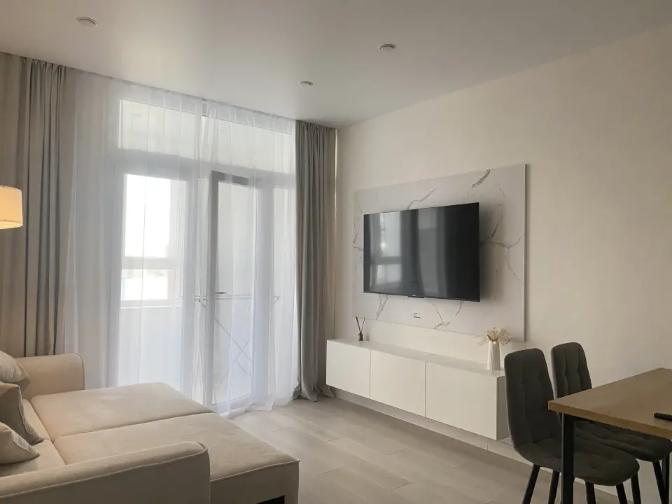 Комната выполнена в светлых нейтральных тонах, что создает атмосферу легкости и простора. В просторной гостиной зоне вы сможете расслабиться на удобном светлом диване, наслаждаясь любимыми фильмами на большом плоском телевизоре. За стильным обеденным столом приятно собраться всей семьей или с друзьями.