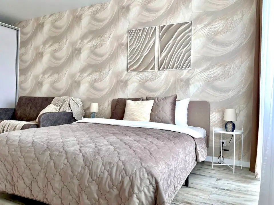 -Двуспальная кровать 160*200, раскладной диван 140*200, при необходимости можем поставить раскладную кровать 80*195.
