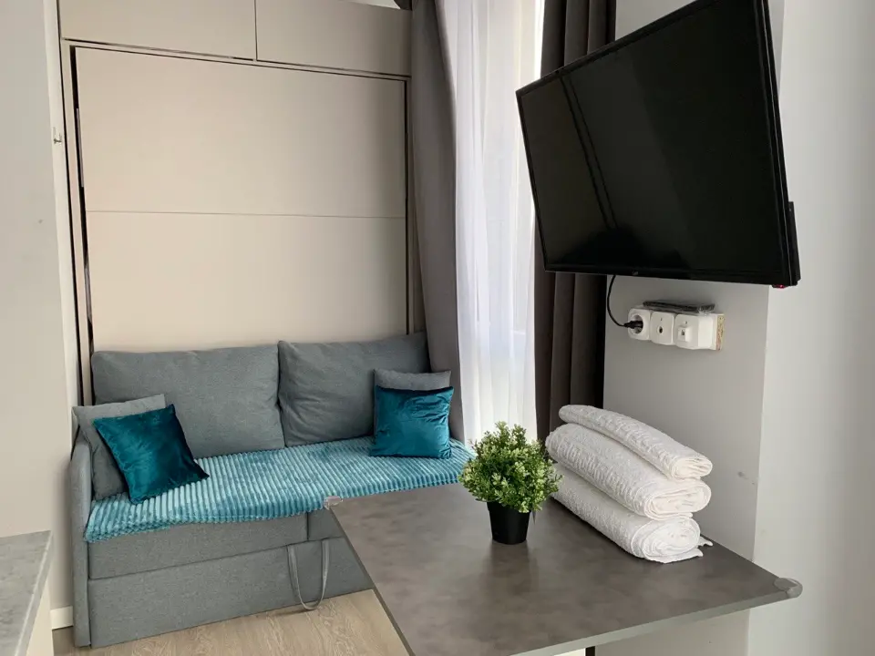 • Двуспальная кровать с ортопедическим матрасом превращается в диван для увеличения комфорта в студии.