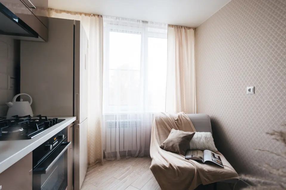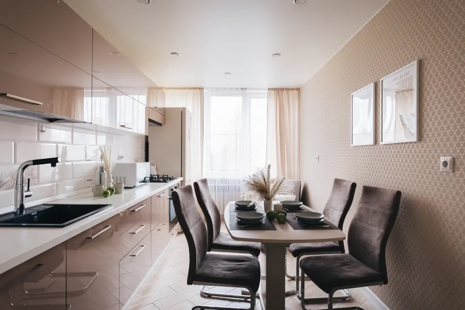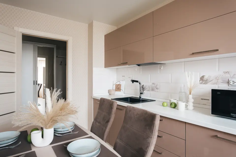Кухня радует глаз современным дизайном и продуманной планировкой. В ней вы найдете все необходимое для приготовления ваших любимых блюд. Удобно расположенные шкафы, широкие рабочие поверхности и качественная бытовая техника — всё это делает кухню идеальным местом для кулинарных экспериментов.