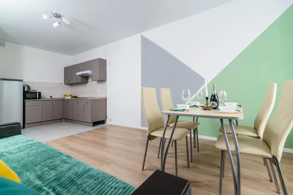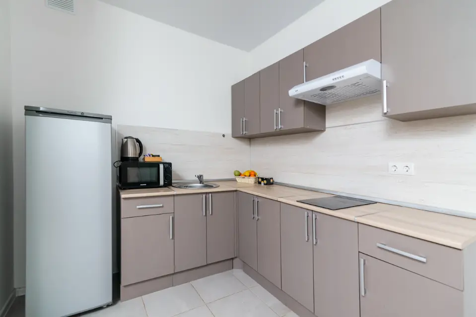 - Полноценная кухня (электроплита, холодильник, микроволновка, чайник)