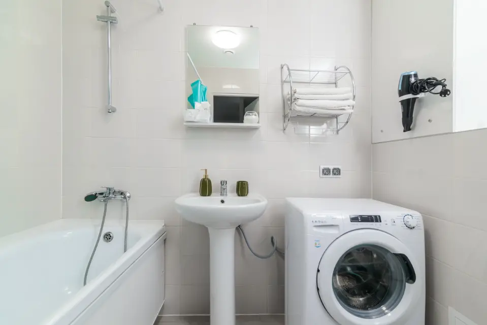 - Санузел совмещённый, ванна, стиральная машина, фен, утюг
